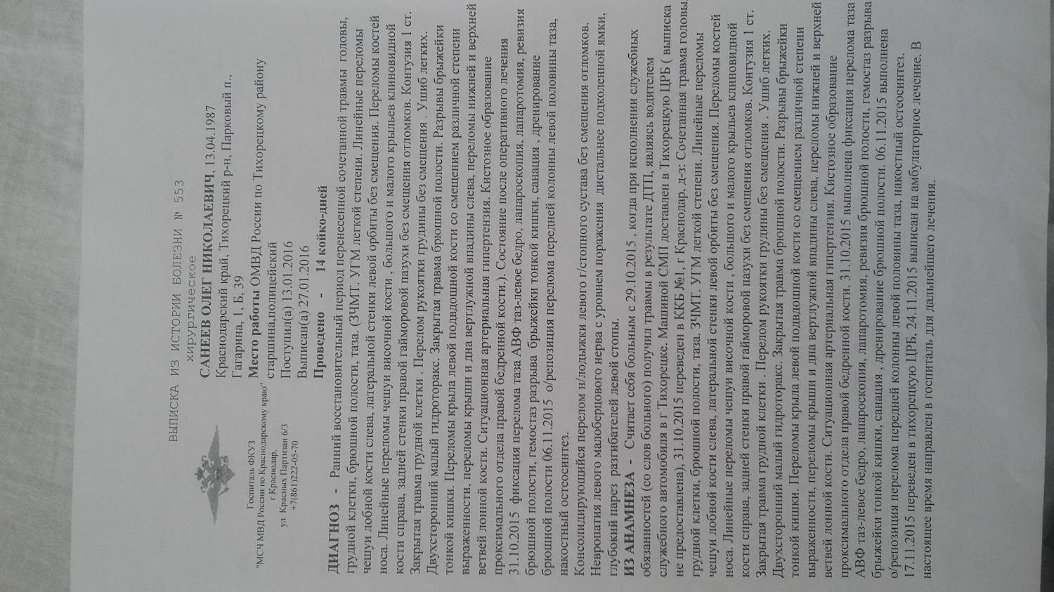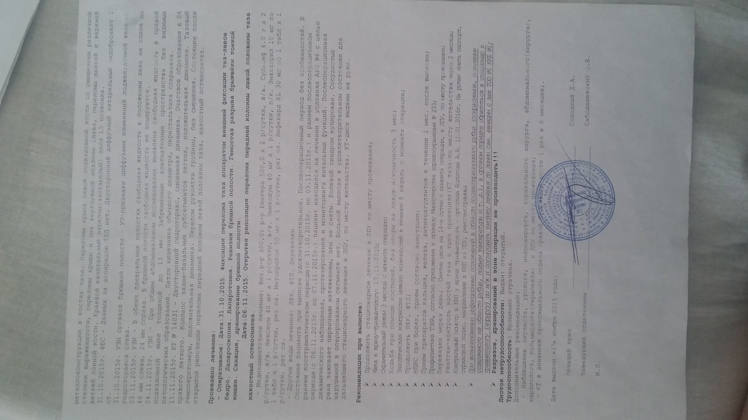 | Добрый день, у меня тоже перелом таза со смещениями стоит металлоконктрукция, так-же поставлен диагноз нейропатия малоберцового нерва (висячая стопа). Травма полученна 29.10.15. 29лет. Установленна военная травма категория Д-не годен. Во вложении расшифровка последнего рентгена, а так же выписки. Возможно ли в данной ситуации расчитывать на какую либо группу? В следующем ответе остальные выписки.