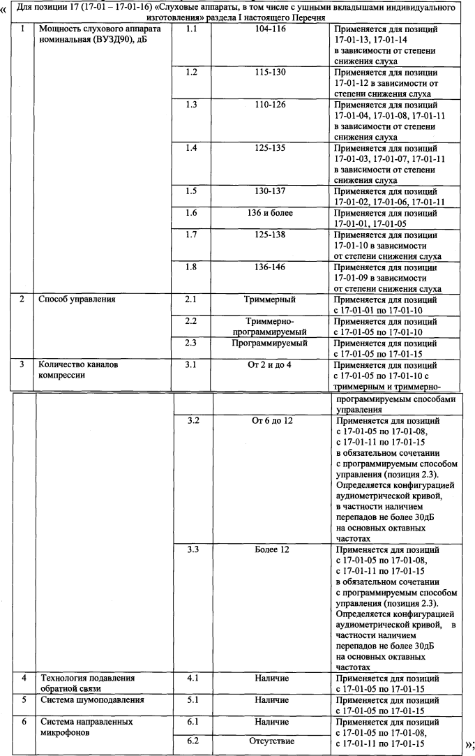 абзацы первый и второй графы «Медицинские показания для обеспечения инвалидов техническими средствами реабилитации» позиций 17-01-12 - 17-01-14 дополнить словами «при отсутствии возможности слухопротезирования заушным слуховым аппаратом и с учетом анатомических особенностей слухового прохода»;